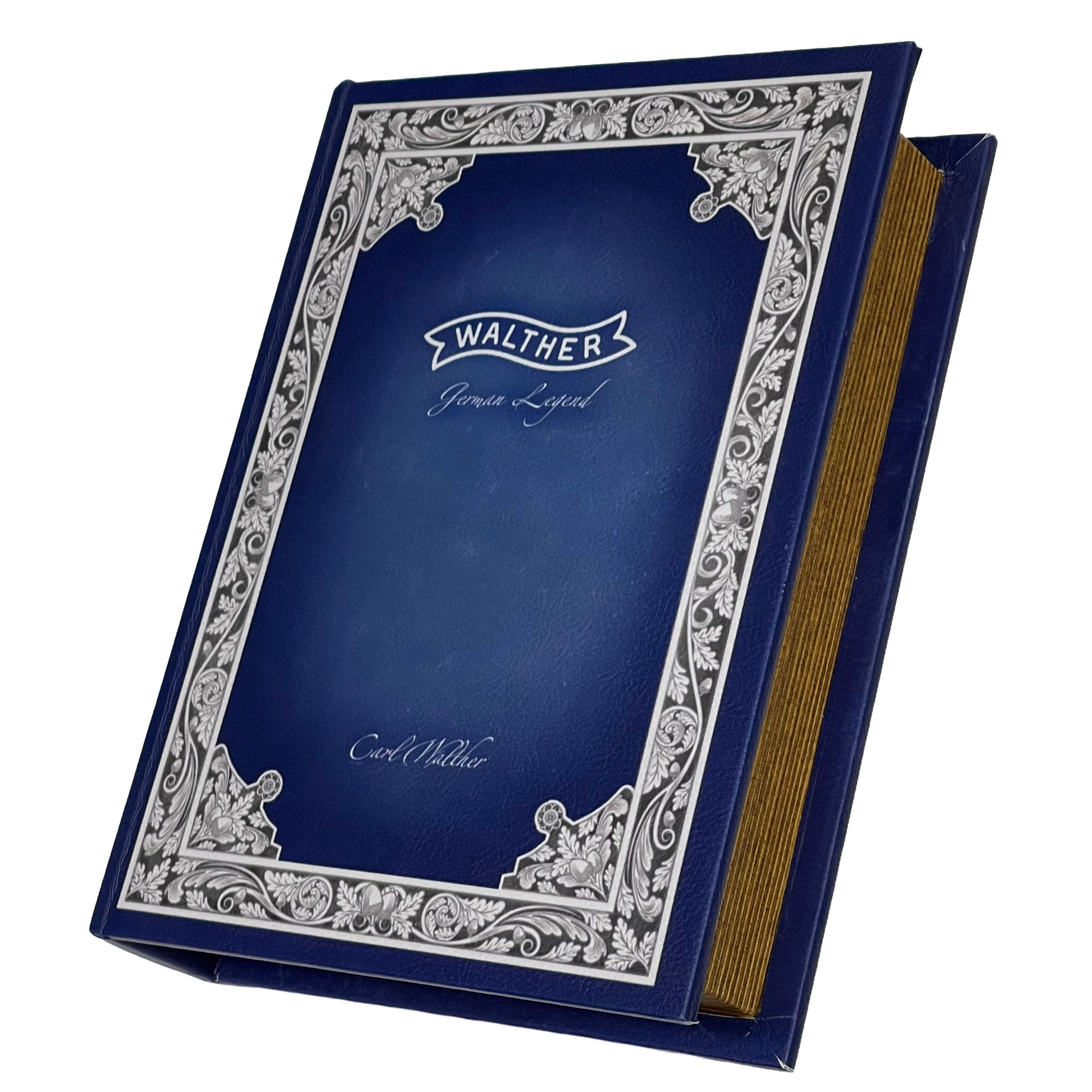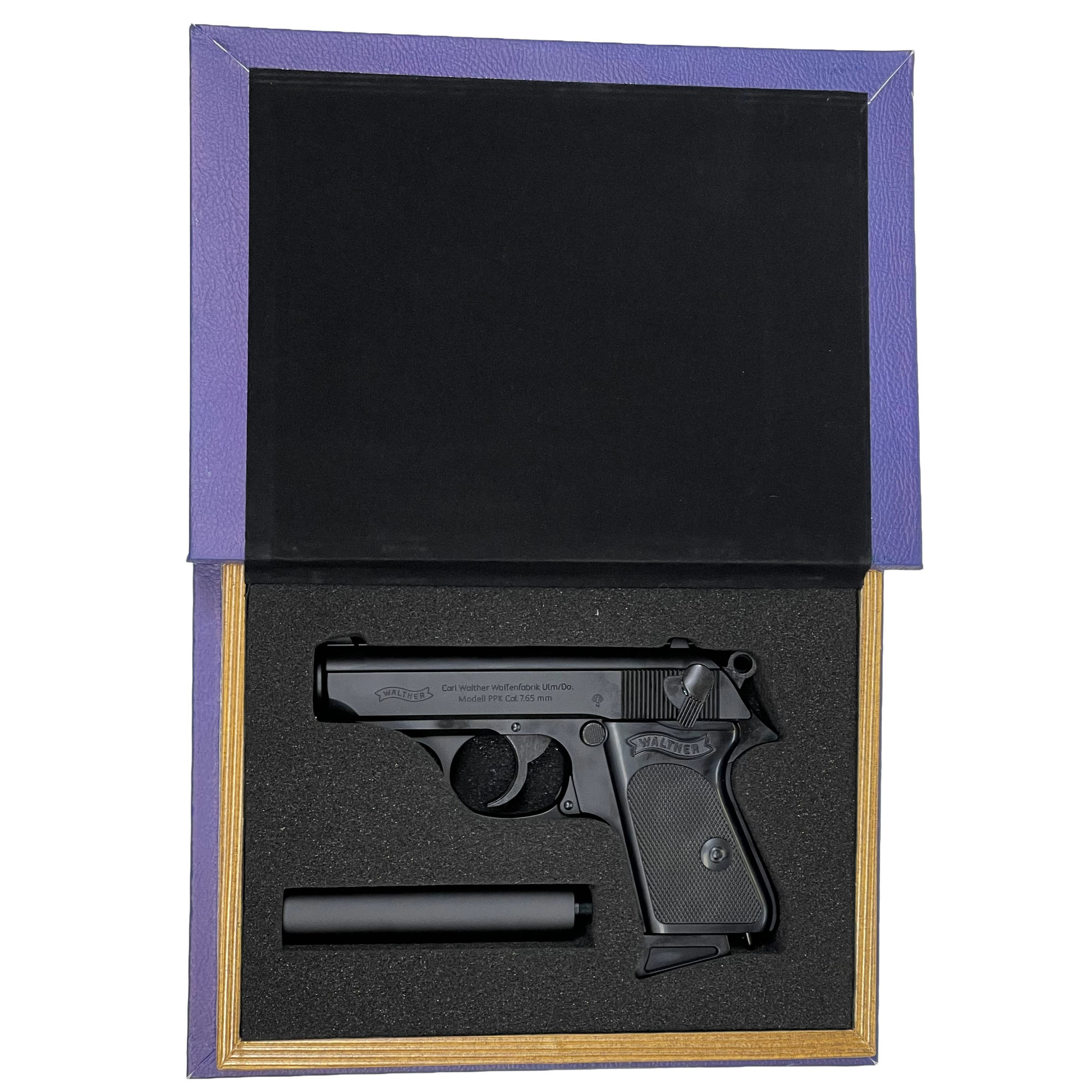 ブックケースはワルサーロゴを飾った高級感ある仕上がり。表紙を開けば、PPKとサイレンサーがすぐに取り出せます。