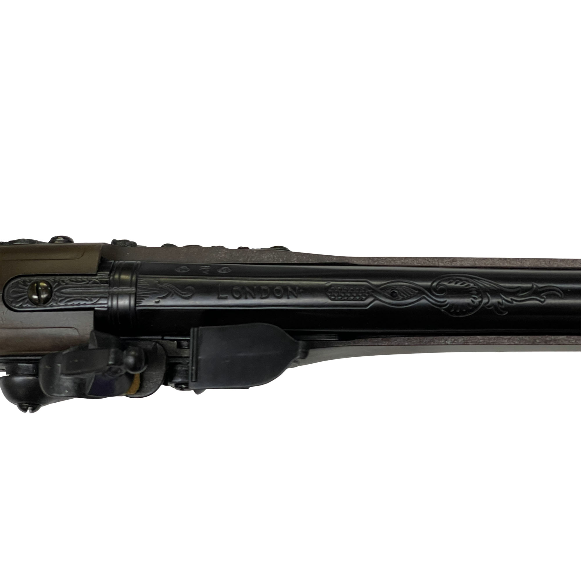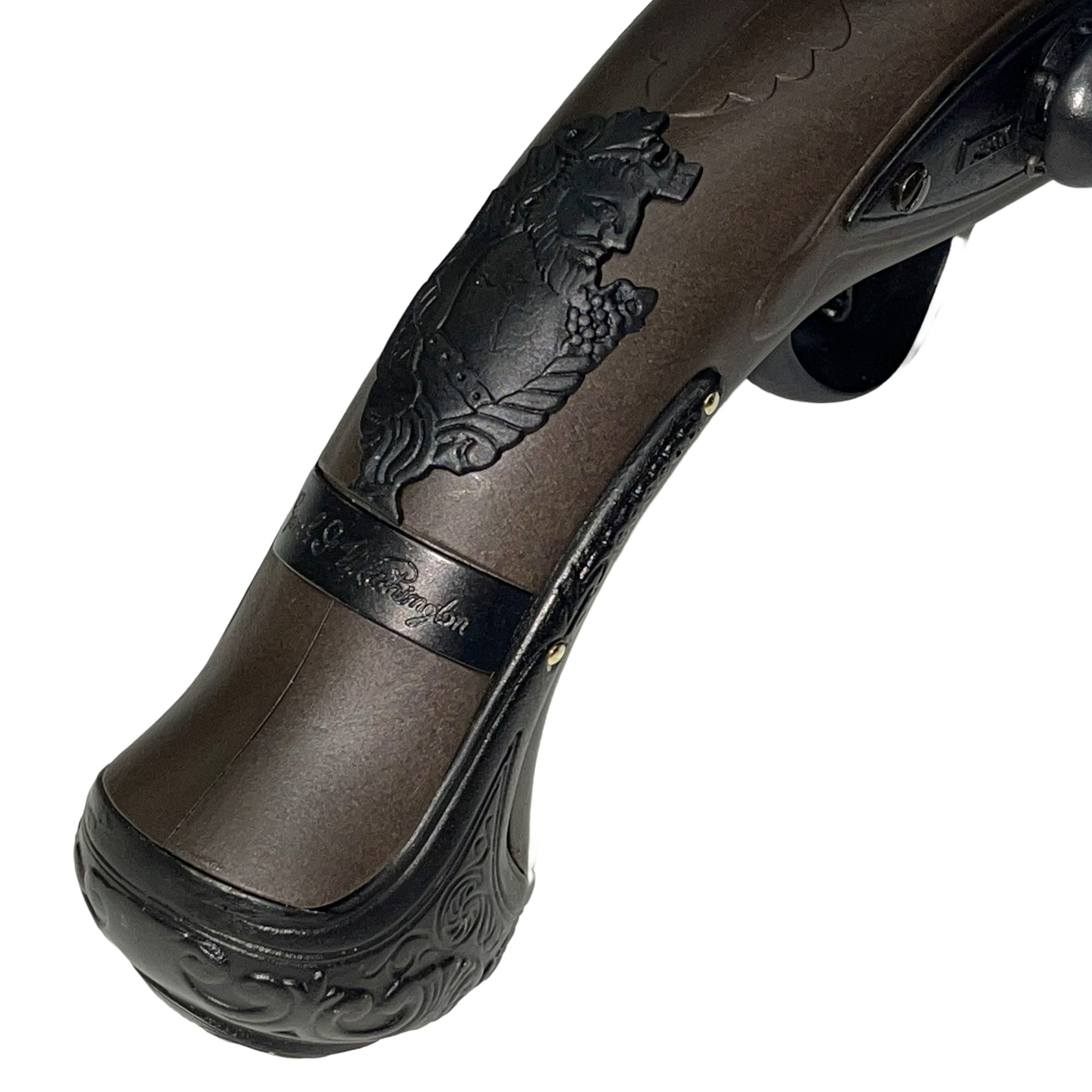 火縄銃(マッチロック)の次の世代となったのが火打石銃(フリントロック)でした。管打ち銃(パーカッション)の登場までの間、18世紀を中心にフリントロックの時代は100年以上続きました。モデルにしたのは1953年にウェストポイントに寄贈された物で、1770年代にジョージ・ワシントン(大統領)銘入りで特注された67口径スムーズボア・フリントロック・ピストルです。
